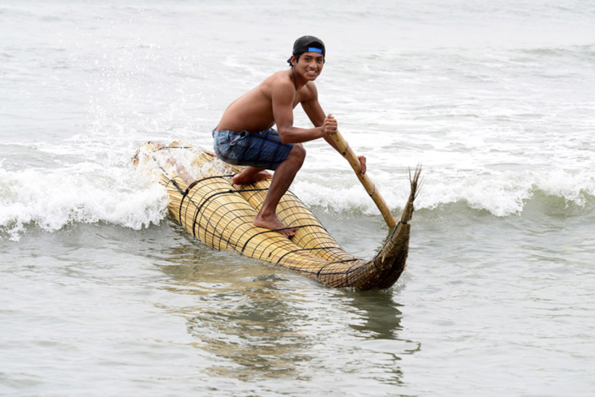 Foto: El reconocido tablista de Huanchaco, Juninho Urcia, mostrando toda su hablidad sobre la embarcacion usada por sus ancestros.